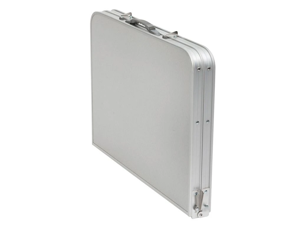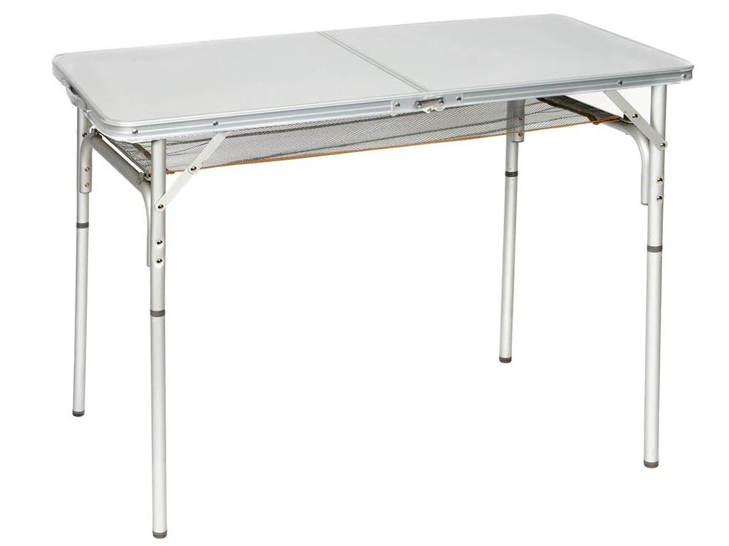 Deze aluminium tafel van Bo-Camp kun je eenvoudig mee nemen doordat hij is in te klappen tot een handig koffermodel. De tafel heeft uitgeklapt een afmeting van 120 x 60 cm en is verstelbaar in twee verschillende hoogtes, 36 en 70 cm. Alle vier de poten zijn voorzien van stelschroeven voor de fijnafstelling. Onder het blad zit een handig lectuurnet zodat je altijd je boek of tijdschrift in de buurt hebt.